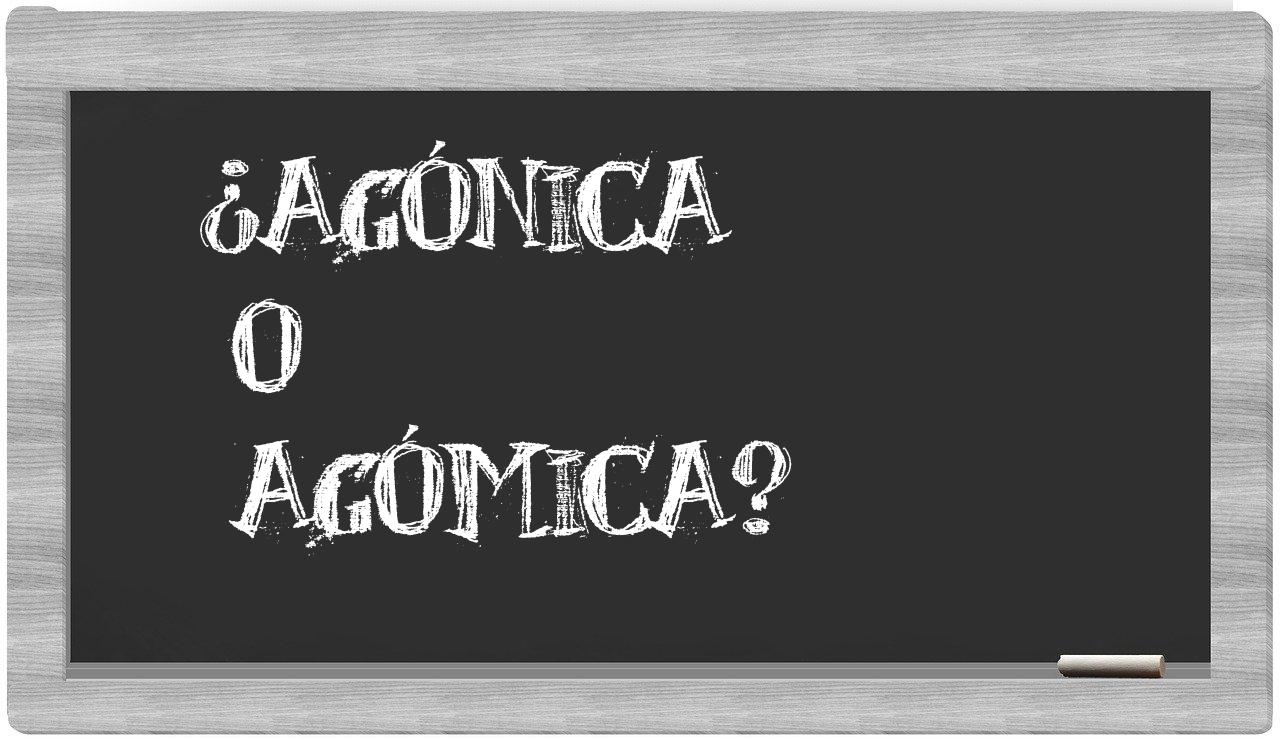 Cuando se trata de la relación entre agónica y agómica, la decisión es clara y no debería generar incertidumbre, puesto que únicamente agónica es la que se encuentra registrada de manera adecuada. En cambio, agómica no se halla en el reconocido Diccionario de la Real Academia Española.