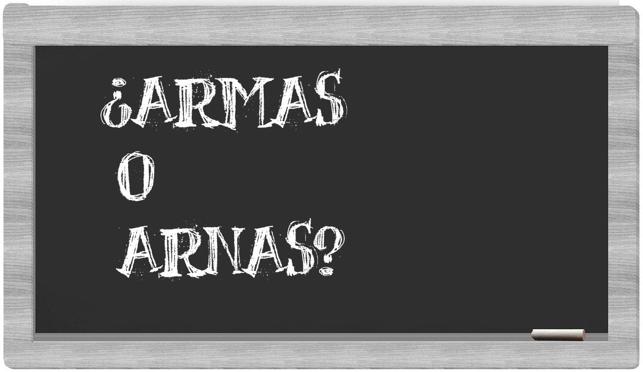 Cuando te encuentres considerando las expresiones armas y arnas, no hay lugar para la incertidumbre, puesto que únicamente armas se encuentra correctamente formulada en el idioma, mientras que arnas no figura en el Diccionario de la Real Academia Española.