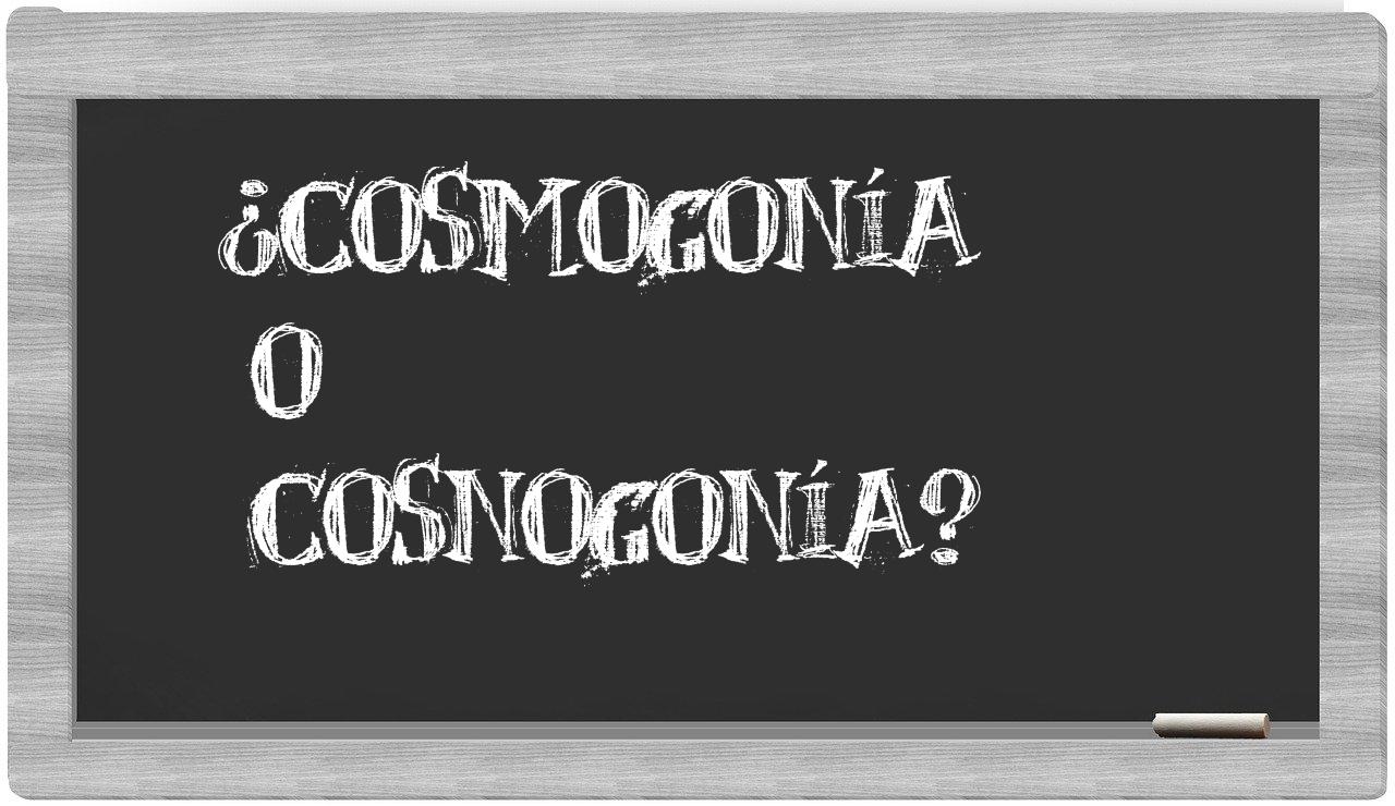 En la situación particular que involucra a cosmogonía y cosnogonía, nunca deberías titubear, puesto que únicamente cosmogonía es la forma adecuada. Por otro lado, cosnogonía no se encuentra registrada en el Diccionario de la Real Academia Española.