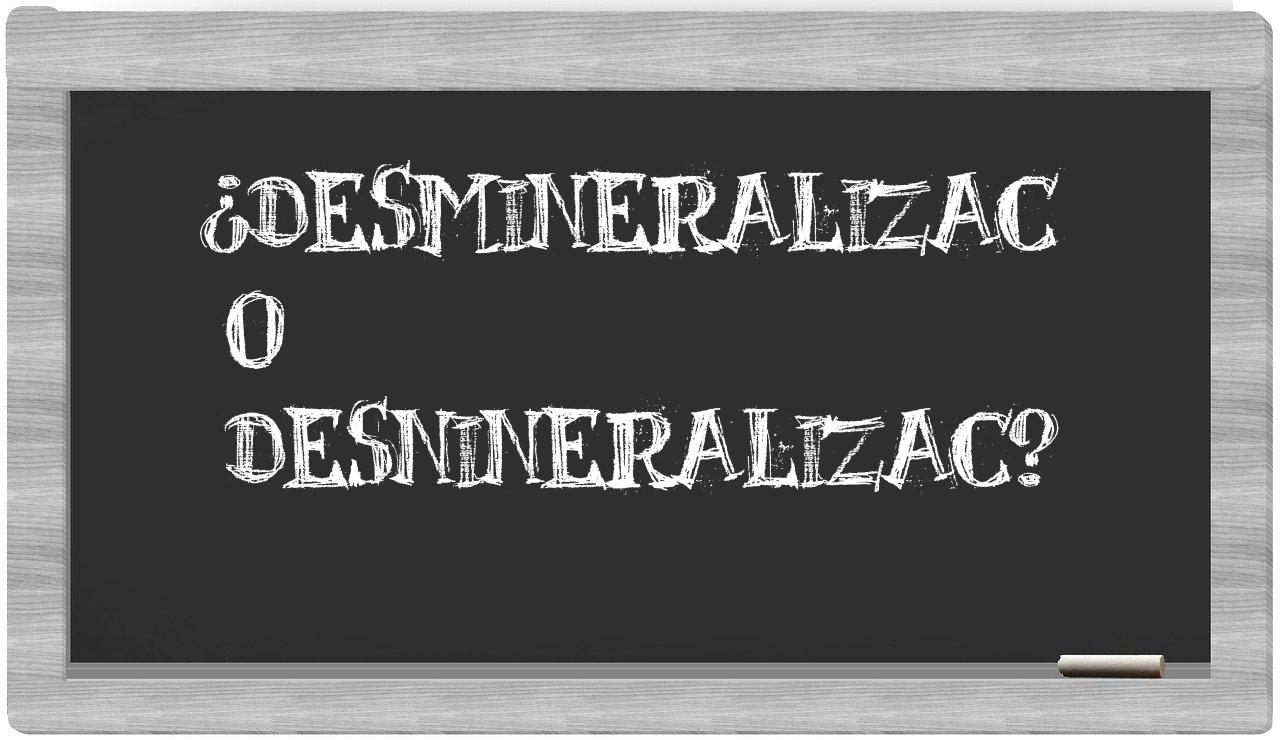 En la particularidad de la relación entre los términos desmineralizac y desnineralizac, no deberías titubear en ningún momento, puesto que únicamente desmineralizac se encuentra correctamente plasmada. La forma desnineralizac está ausente del Diccionario de la Real Academia Española.
