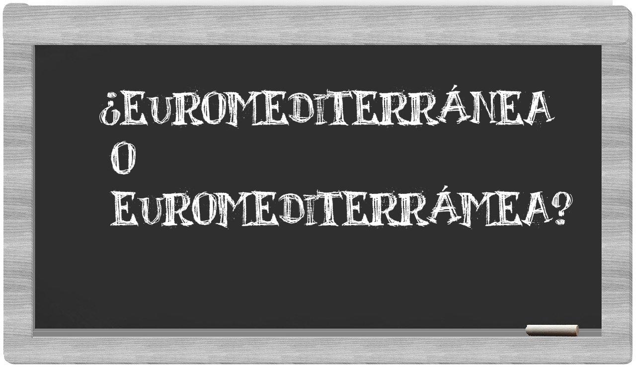 Cuando se trata de elegir entre euromediterránea y euromediterrámea, es crucial que no vaciles, puesto que únicamente euromediterránea es la opción que se encuentra correctamente redactada. La forma euromediterrámea no figura en el Diccionario Oficial de la Real Academia Española.