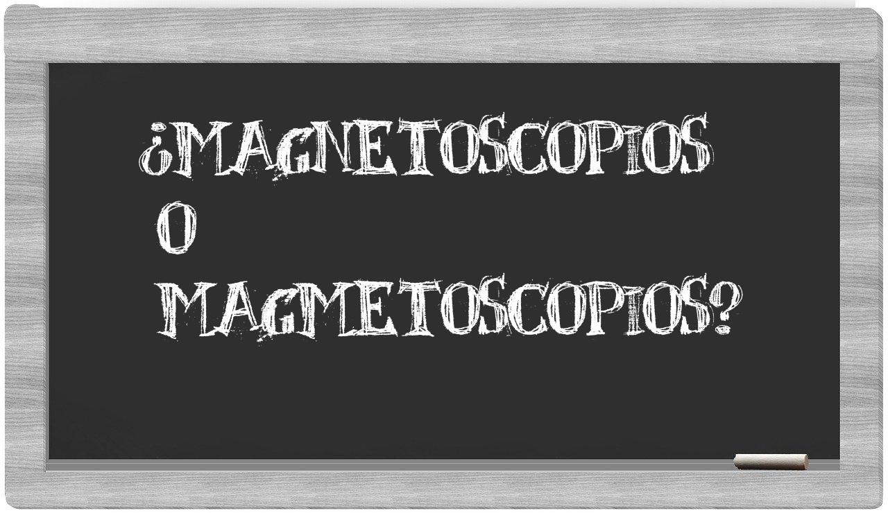 Cuando te enfrentes a las palabras magnetoscopios y magmetoscopios, no debería haber lugar para la incertidumbre, porque es únicamente magnetoscopios la que está registrada adecuadamente, mientras que magmetoscopios no figura en el Diccionario de la Real Academia Española.