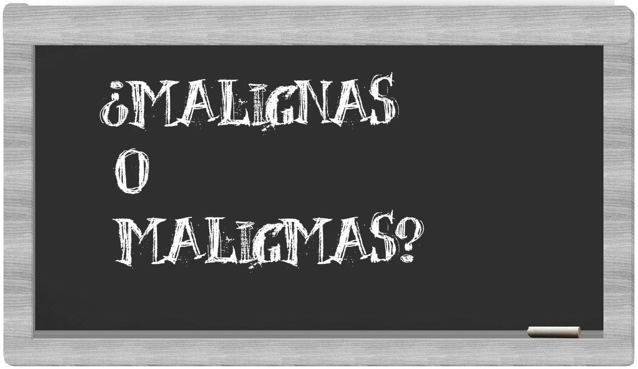 Cuando se trata de las palabras malignas y maligmas, no hay motivo para vacilar, puesto que únicamente malignas está debidamente redactada. La palabra maligmas, por otro lado, brilla por su ausencia en el Diccionario de la Real Academia de la Lengua.